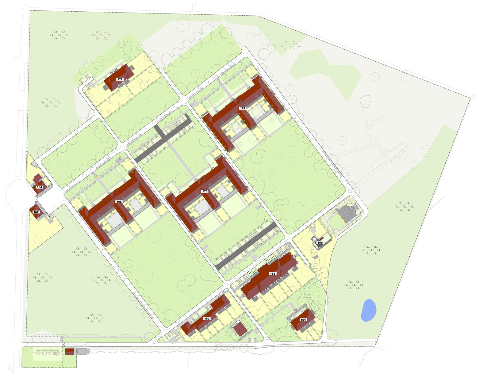 Gegenstands des Entwurfs für die Freianlagen ist der rd. 8 ha große Kernbereich mit dem denkmalgeschütztem Gebäudebestand. In den ehemaligen Klinikgebäuden entstehen unter Berücksichtigung der denkmalpflegerischen Anforderungen insgesamt 118 Wohnungen. Den Wohnungen sind überwiegend südlich angeordnete Hausgärten zugeordnet. Die übrigen Freiflächen werden gemeinschaftlich genutzt. Hauptaugenmerk der Freianlagengestaltung ist die Herausarbeitung des strukturgebenden Gerüstes der Straßen und Wege mit dem Eingangsplatz an der Hauptzufahrt sowie die behutsame Überarbeitung der großzügigen Freiflächen zwischen den Gebäuden. Die historischen Pflasterbeläge sollen nach Möglichkeit erhalten und ergänzt werden.