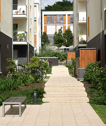Im Bezirk Friedrichshain, nahe dem Volkspark Friedrichshain, wurde das ca. 4400 m² große Grundstück mit 6 Stadthäusern bebaut. Aufgrund seiner Hanglage wurde das Gelände auf 3 Ebenen mit je 2 Häusern terrassiert. Die notwendigen Stützmauern unterteilen den privaten vom halböffentlichem Aussenraum. Ein rasterartiges Wegenetz verbindet Hauseingänge und 3 Zugänge zum Grundstück. Zwischen den Häusern musste je eine Feuerwehraufstellfläche bereitgestellt werden, welche durch ein Muster aus Schotterrasen, Gehwegplatten und Kies gestaltet wurde. Unter dem Grundstück befindet sich eine Tiefgarage.
